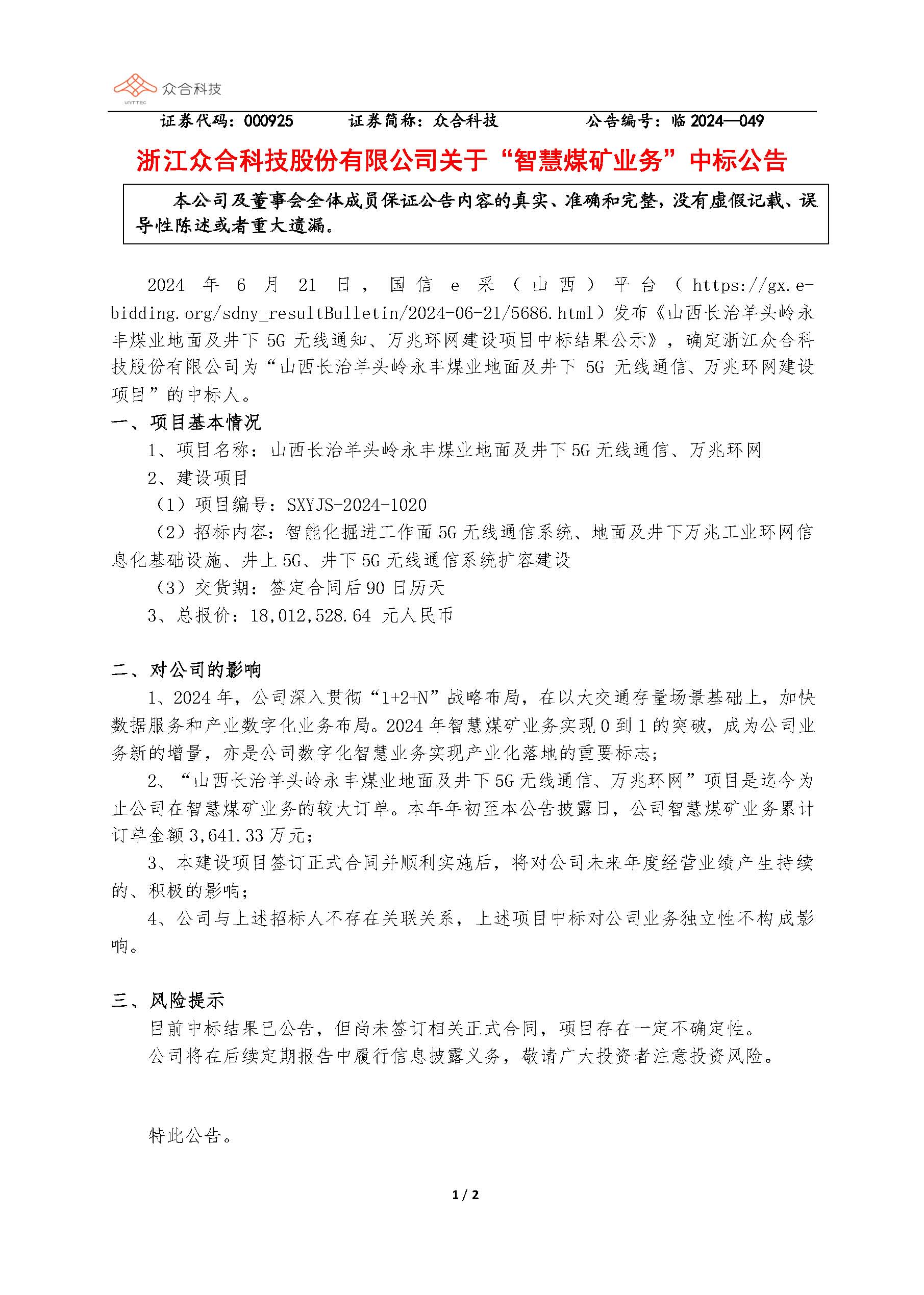 近日,眾合科技成功中標“山西長治羊頭嶺永豐煤業(yè)地面及井下5G無線通信、萬兆環(huán)網(wǎng)建設(shè)項目”,進一步鞏固了公司在智慧煤礦領(lǐng)域的市場地位,并為公司未來發(fā)展注入新的動力。