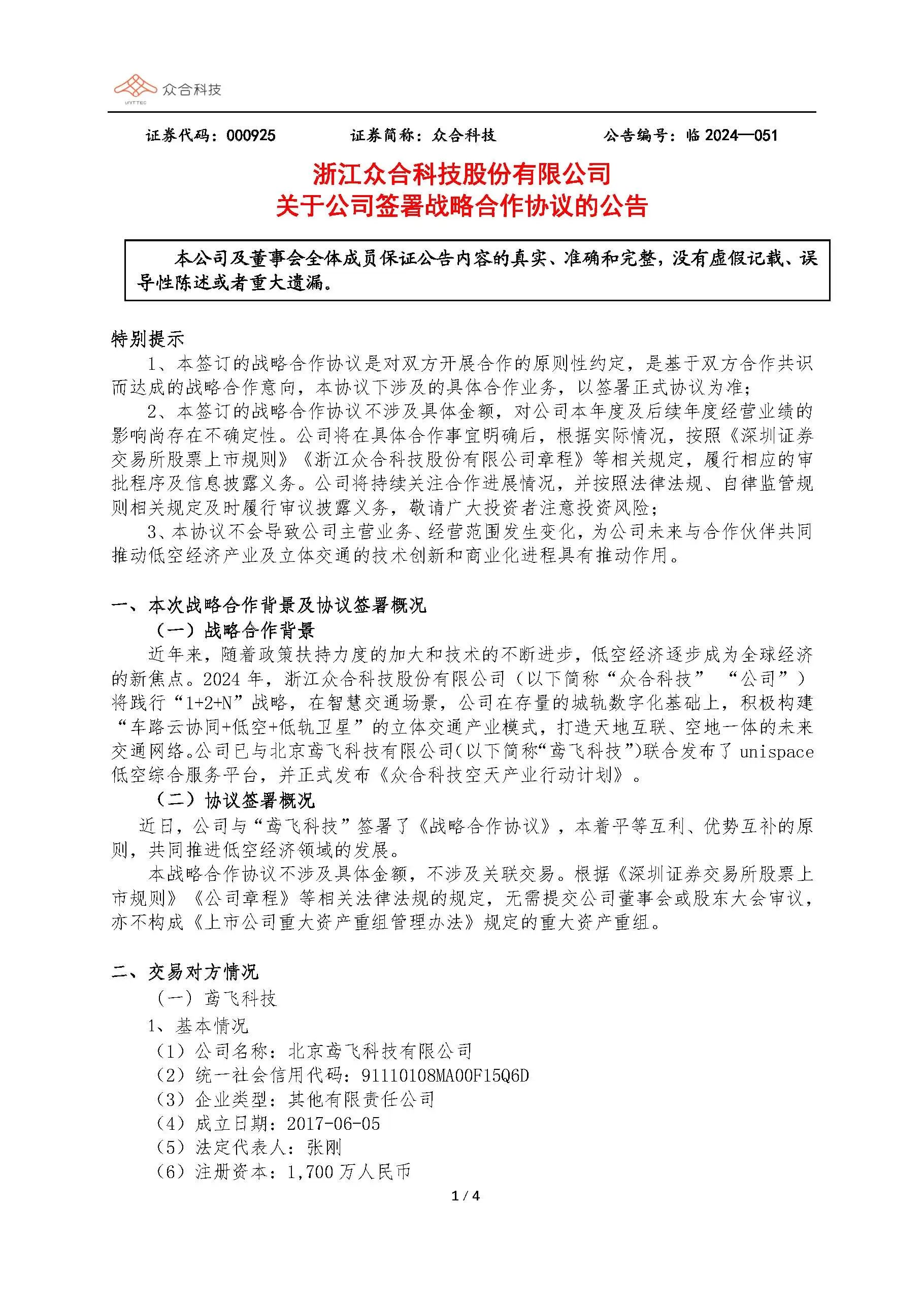 6月27日,眾合科技發(fā)布公告稱,與北京鳶飛科技有限公司(以下簡稱“鳶飛科技”)正式簽署了戰(zhàn)略合作協(xié)議。根據(jù)協(xié)議,雙方將展開多方位深度合作,涵蓋技術(shù)、股權(quán)、應(yīng)用場景和渠道資源等多個關(guān)鍵領(lǐng)域,共同推動低空經(jīng)濟領(lǐng)域的創(chuàng)新與發(fā)展,實現(xiàn)資源共享、優(yōu)勢互補、互利共贏。