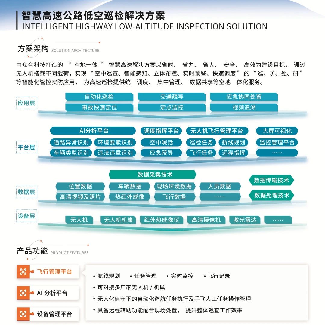 基于眾合低空綜合服務(wù)平臺(tái),由眾合科技打造的 “空地一體”智慧高速低空巡檢解決方案以高速巡檢場(chǎng)景為切入,以省時(shí)、省力、省人、安全、高效為建設(shè)目標(biāo),通過無(wú)人機(jī)搭載不同載荷,實(shí)現(xiàn) “空中巡查、智能感知、立體布控、實(shí)時(shí)預(yù)警、快速調(diào)度”的 “巡、防、處、研 ”等智能化管控安防應(yīng)用,為智慧高速提供統(tǒng)一調(diào)度、集中管理、數(shù)據(jù)共享等空地一體化服務(wù)。