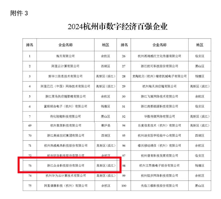 近日,根據(jù)市政府統(tǒng)一部署,在杭州市經(jīng)濟和信息化局等有關部門的支持下,各行業(yè)協(xié)會、廣大企業(yè)的參與下,杭州市工業(yè)經(jīng)濟聯(lián)合會、杭州市企業(yè)聯(lián)合會、杭州市企業(yè)家協(xié)會聯(lián)合發(fā)布了“2024杭州市數(shù)字經(jīng)濟百強企業(yè)榜單”。眾合科技憑借在數(shù)字經(jīng)濟領域的卓越表現(xiàn)榮耀上榜,這是公司自2022年榜單設立以來連續(xù)第三年獲此殊榮,彰顯了其在數(shù)字經(jīng)濟浪潮中的強勁實力和領先地位。